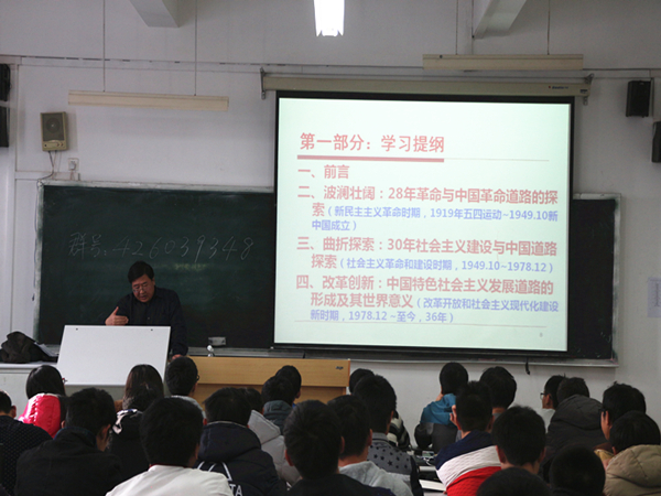 11月29日下午,潘福生在天山堂A412教室作了题为“深入学习党史,端正政治追求”的党课。他带领大家回顾了中国共产党走过的95年光辉岁月,采取举例论证的方法引导大家了解学习了中国共产党领导社会主义建设与中国道路探索走过的艰辛历程。潘书记指出:“在中华民族面临历史危难关头时,是党领导人民进行艰苦卓绝的奋斗,从而实现了中国这个13亿人口的五千年文明古国的伟大复兴。”他希望大家要坚持中国特色社会主义的道路自信、理论自信、制度自信、文化自信,为实现‘两个一百年’奋斗目标,实现中华民族伟大复兴中国梦而努力奋斗。