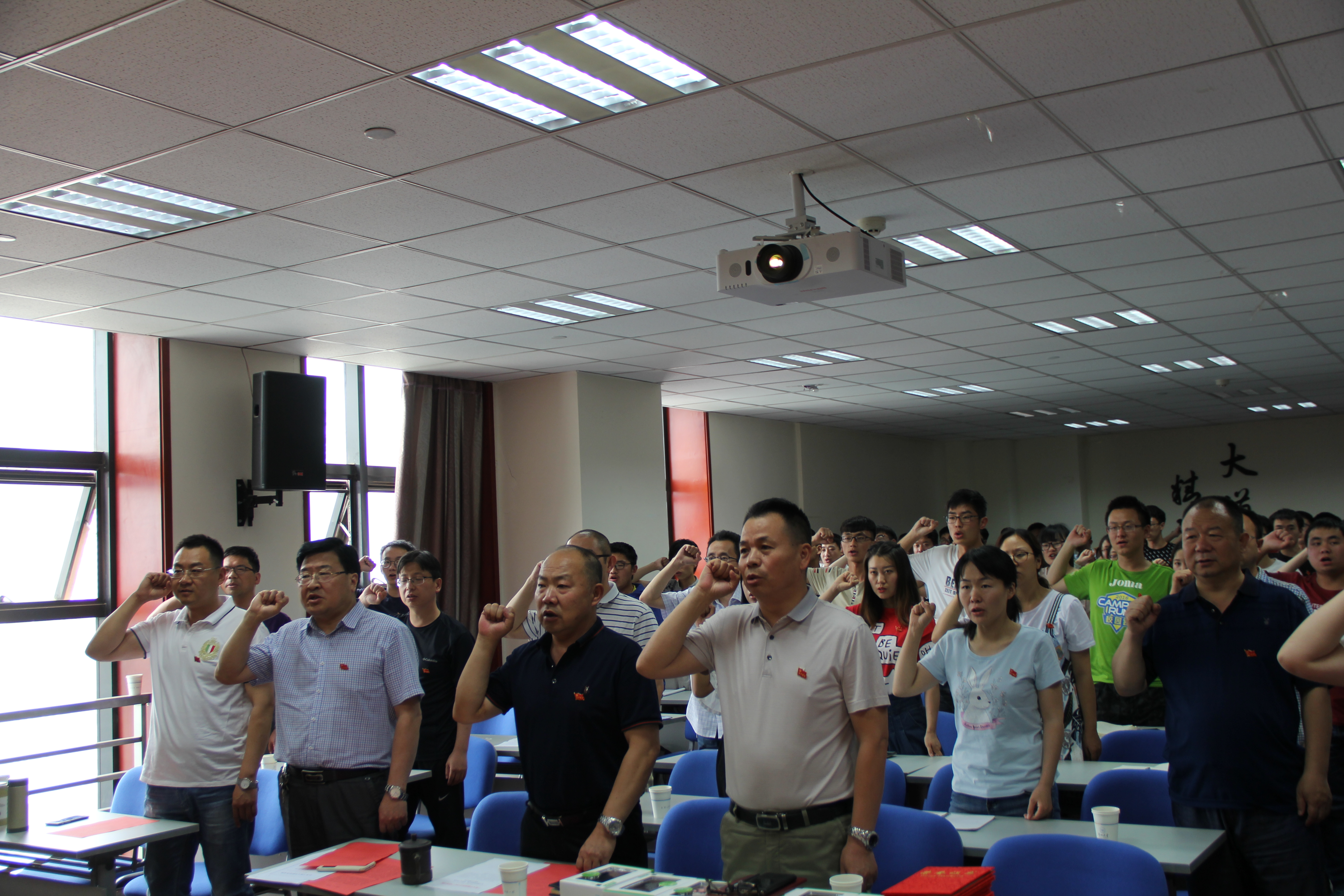 下午3:00,大会在雄壮的《国歌》声中拉开帷幕。会议开始,由学院党委专职组织员胡泽蕙同志领誓,全体党员面向鲜红党旗,重温了入党誓词及新党员宣誓仪式,“我志愿加入中国共产党……” 不忘初心,牢记使命,锤炼党性,继续前进。铿锵有力的声音久久回荡。