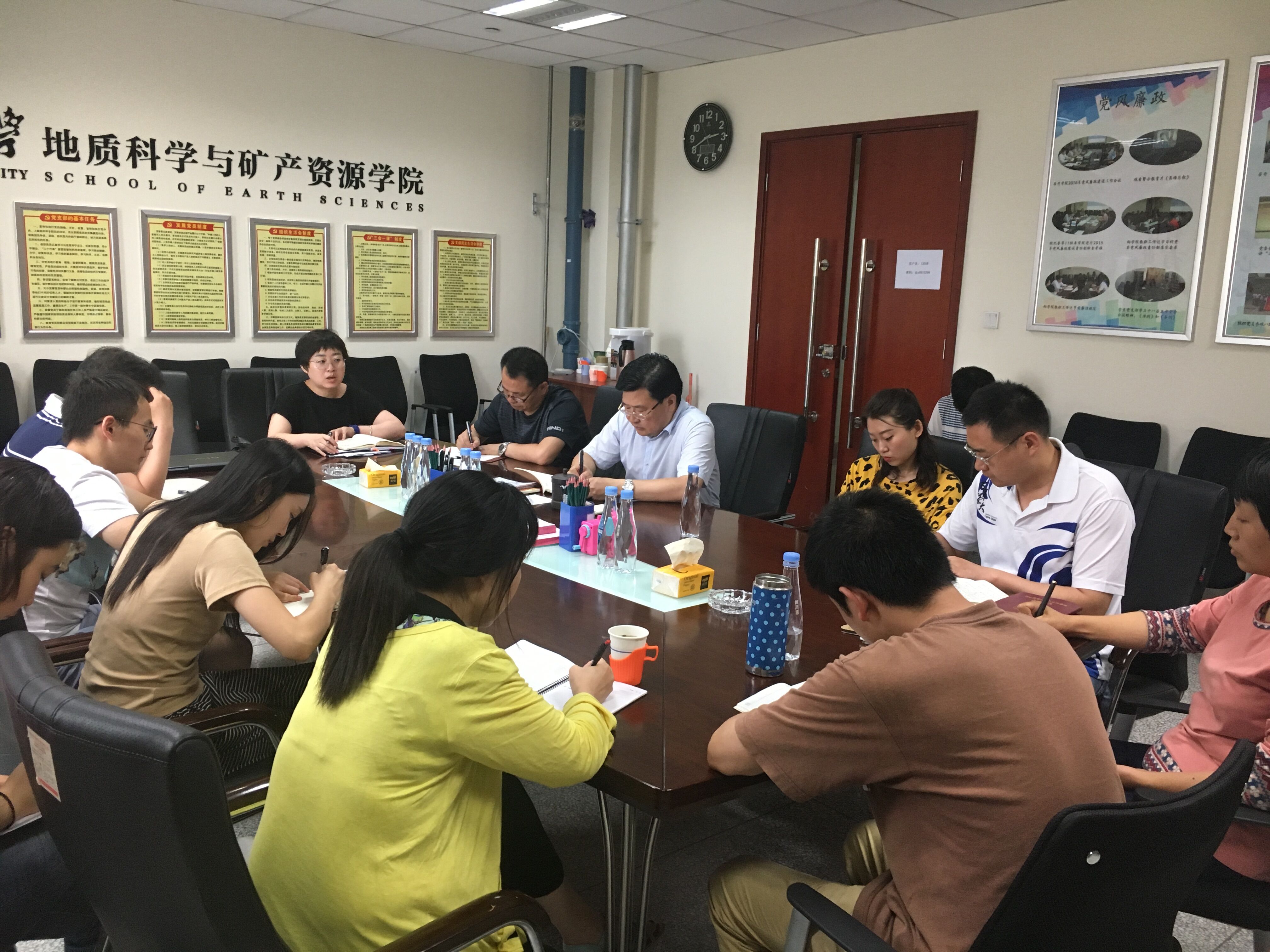 2018年7月3日下午,在观云楼1305 党员活动室,地矿学院召开中心组学习暨党建工作促进会,学院党委中心组成员、各党支部支委参加,党委书记潘福生主持会议。